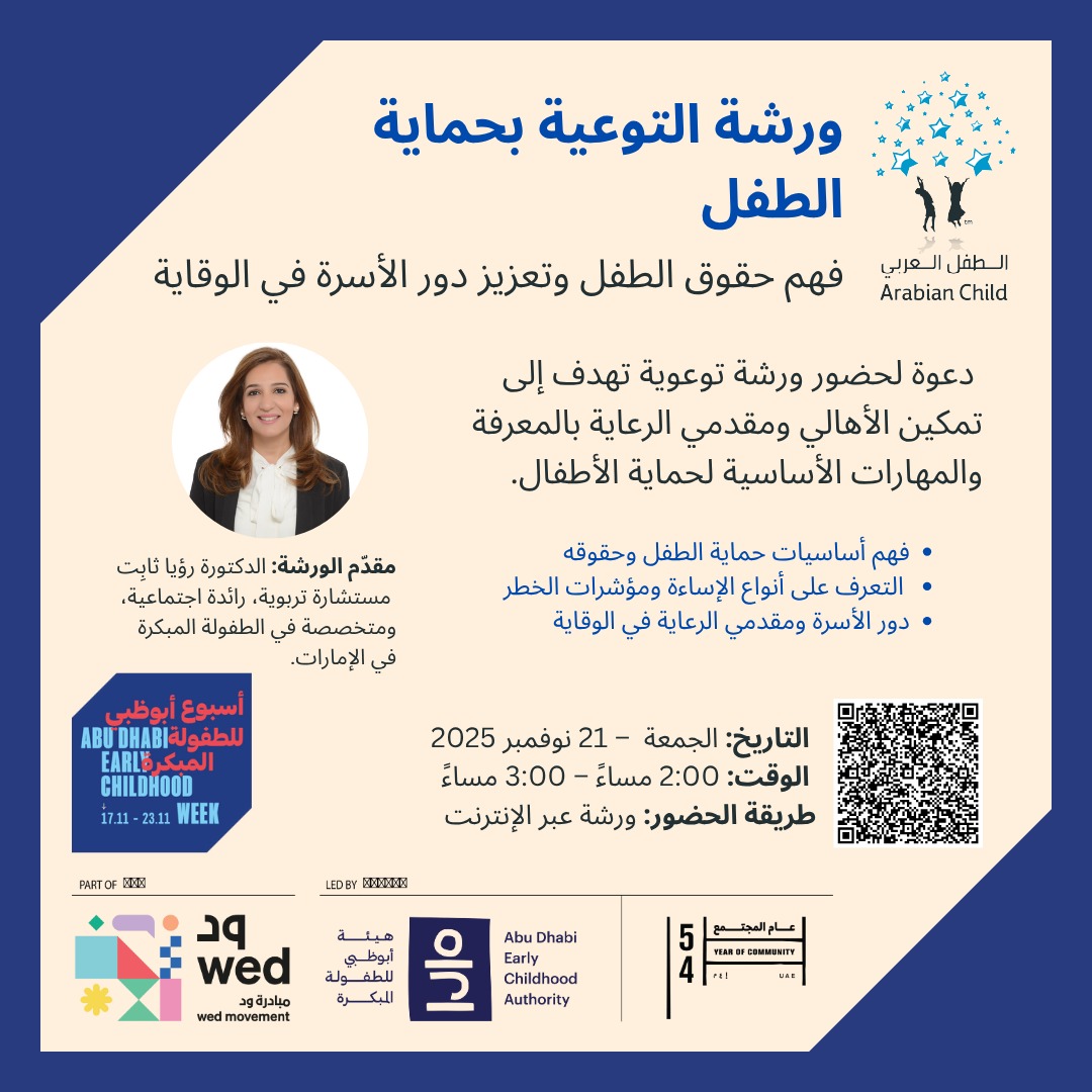الوعي بحماية الطفل: الحقوق، التعرف، والاستجابة -تمكين المشاركين من اكتساب المعرفة والمهارات الأساسية للدفاع عن حقوق الأطفال وحمايتها.
